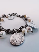 Stainless steel chain bracelet with real vintage religious medallions and freshwater pearls.