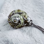 Un coquillage vert naturel, soudé à la main à l’étain sans plomb et orné de détails métalliques organiques. Monté sur une chaîne en acier inoxydable et accompagné d’une perle suspendue, ce bijou évoque les profondeurs marines et la beauté sauvage de la mer. Une pièce à la fois brute et envoûtante, comme une relique sortie des vagues.