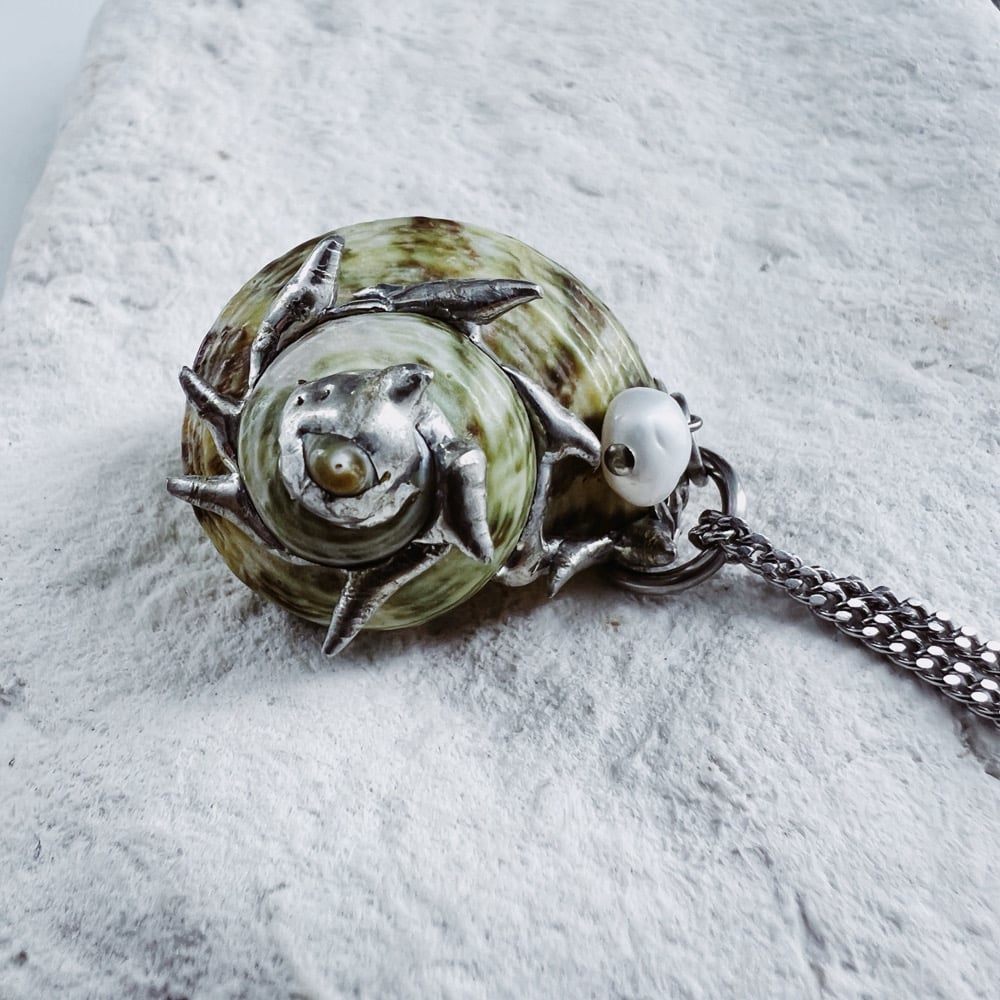 A natural green seashell, hand-soldered with lead-free tin and detailed with organic metallic accents. Mounted on a stainless steel chain and finished with a suspended pearl, this piece captures the untamed beauty of the sea — raw, mystical, and timeless, like a relic washed ashore.
