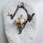 A natural seashell, hand-soldered with lead-free tin and detailed with organic metallic accents. Mounted on a stainless steel chain and finished with a suspended pearl, this piece captures the untamed beauty of the sea — raw, mystical, and timeless, like a relic washed ashore.