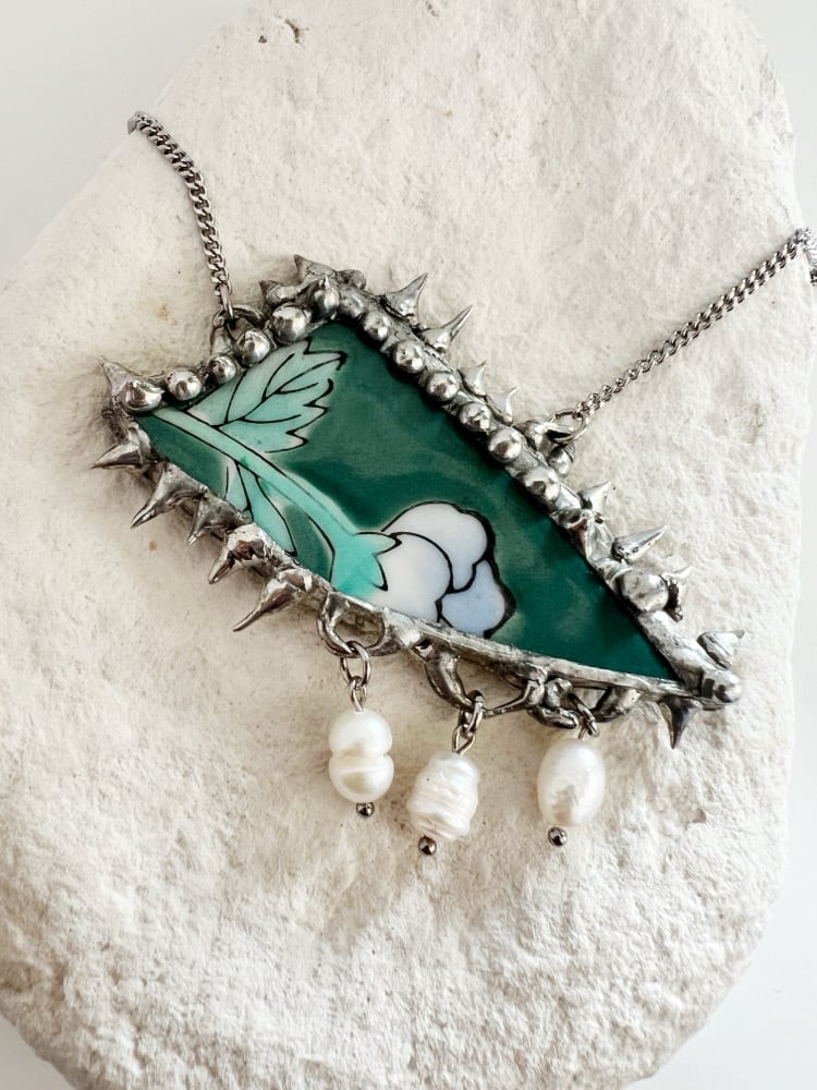 A fragment of vintage porcelain, hand-soldered with lead-free tin and framed in sculpted metal spikes. Freshwater pearls hang below — delicate contrast to the sharp edges.