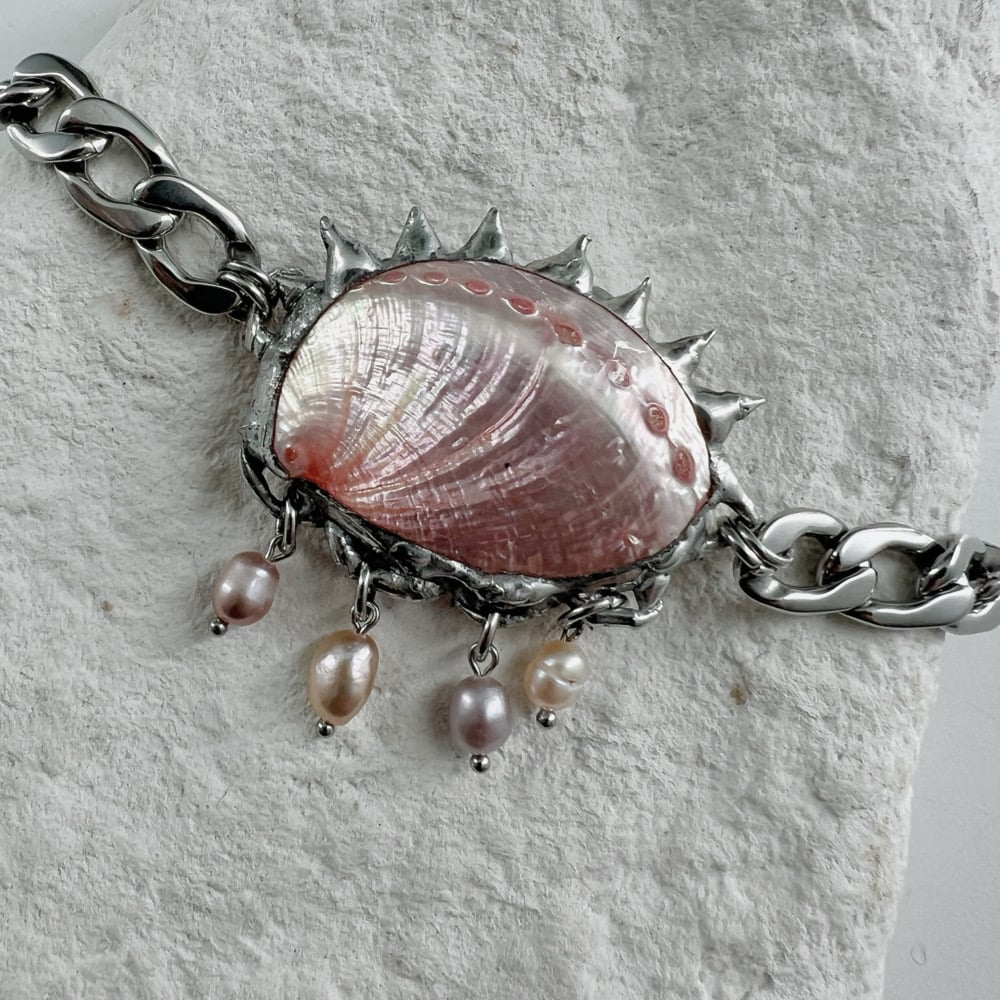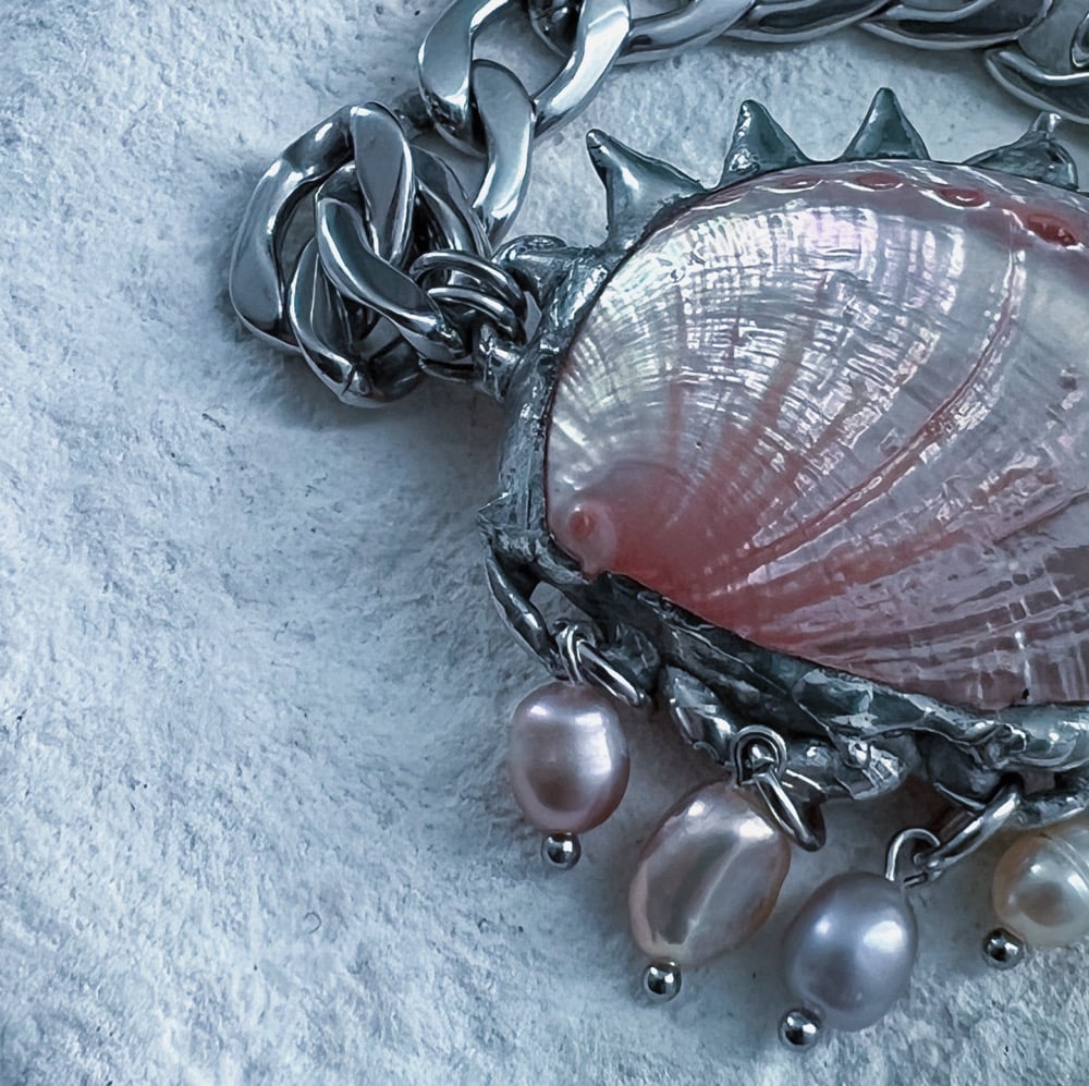 Materials: Seashell, pearls, lead-free solder, stainless steel.